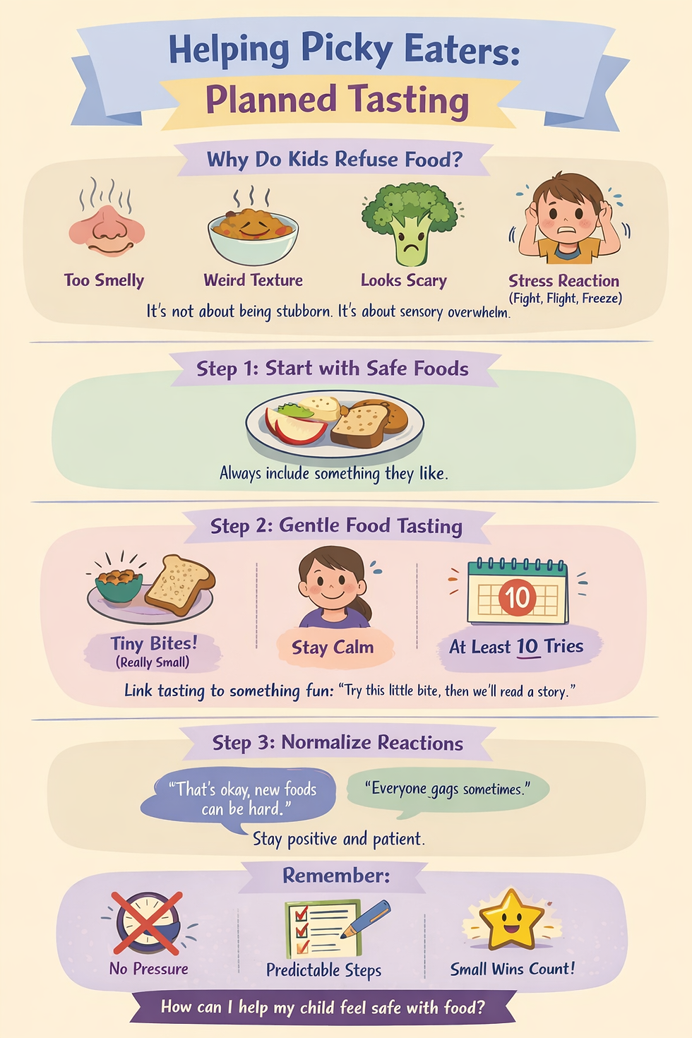 With school-aged children (8–10+ years), planned tasting can be introduced, where the child tastes very small amounts, stress-free, over at least 10 occasions. One taste is almost never enough for acceptance. New foods present entirely new sensory information that the child must learn to tolerate and process.